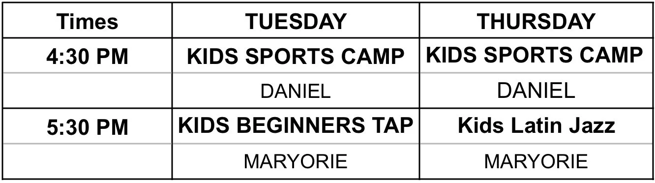 Kids Latin Jazz is a high-energy class that starts with flexibility exercises and blends salsa, jazz, merengue, bachata, hip hop, reggaeton, and light acrobatics. Ages 6-12.